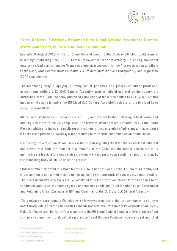 “Data privacy is paramount to Workday, which is why we were one of the first companies to certify to both Privacy Shield and the Asia-Pacific Economic Cooperation Cross-Border Privacy Rules and Privacy Rules for Processors. Being the first to adhere to the EU Cloud Code of Conduct is further proof of our continued commitment to global data protection,” said Barbara Cosgrove, vice president and chief privacy officer, Workday. “We value the leadership shown by SCOPE Europe and the EU Cloud CoC General Assembly and their efforts to ensure enterprise cloud service providers continue to uphold the highest standards of data protection.”